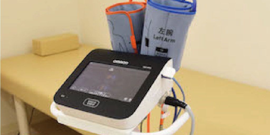 動脈硬化の程度を測定します。患者さん用にイラストや血管年齢が記載されているプリントをお渡しします。 自覚症状がないことから「沈黙の殺人者」と呼ばれる動脈硬化症ですが、簡単に発見できる方法があります。この検査では、あお向けに寝た状態で両腕・両足首の血圧と脈波を測定します。時間は3分程度で、血圧測定と同じ感覚でできる簡単な検査です。結果もすぐに出るので、その日のうちに診断が受けられます。