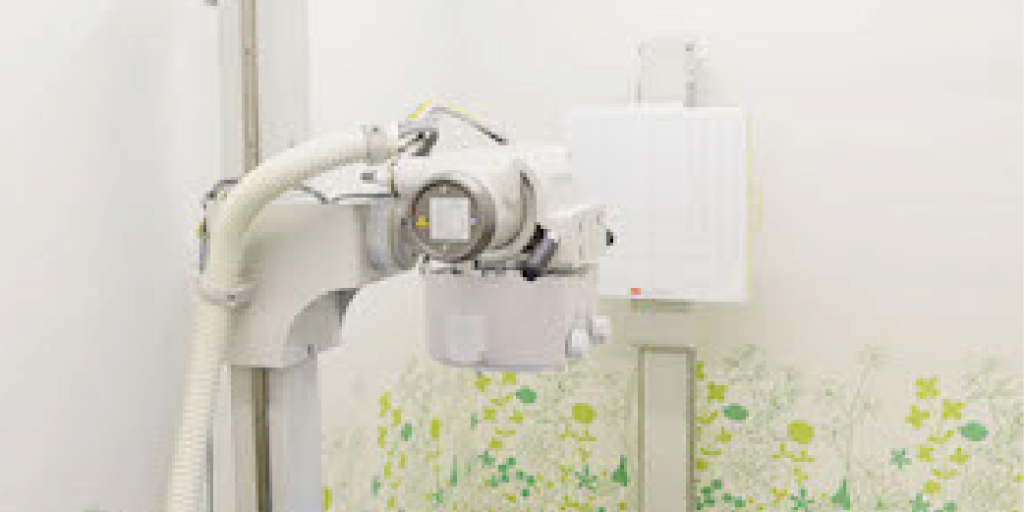 レントゲン室という閉鎖空間のため壁紙を明るくしました。また、撮影部位によっては放射線防護着を使用し被曝を最小限に抑えます。